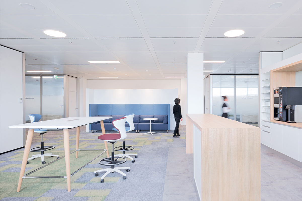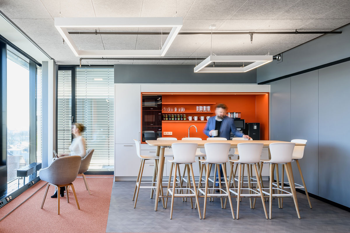Bei Sanofi in Frankfurt lädt ein großzügiger zentral gelegener Get Together-Bereich zum formellen und informellen Austausch ein – nicht nur zur Mittagszeit, sondern den ganzen Tag.