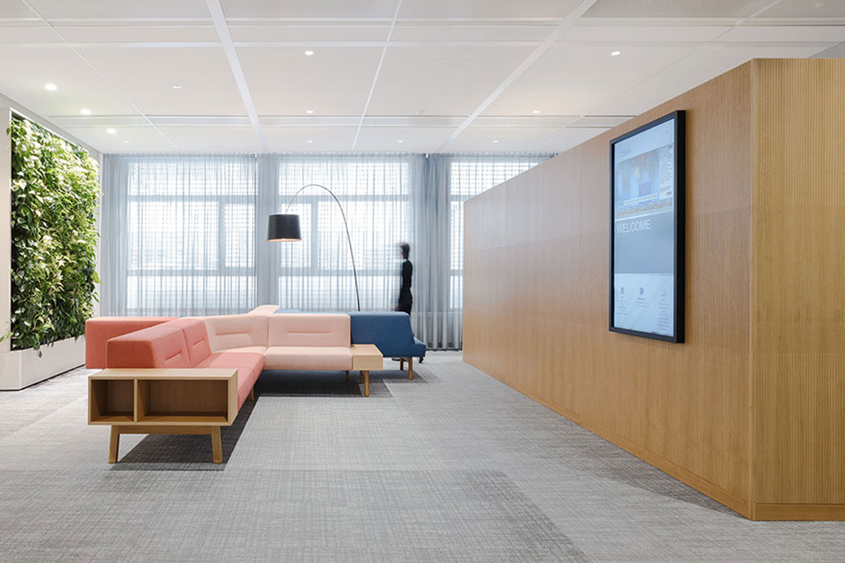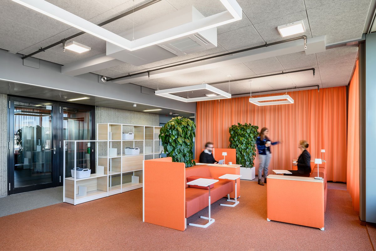 Loungebereich für unseren Kunden CureVac in Wiesbaden als zentraler Ort für Austausch & Begegnung.