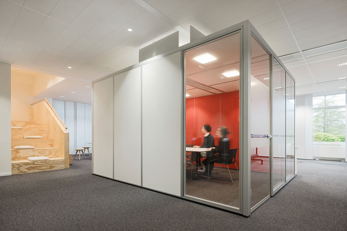 Absichtsvoll platzierte Raum-in-Raum Systeme strukturieren offene Flächen und bieten gleichzeitig Rückzugsorte für analoge und hybride Meetings.