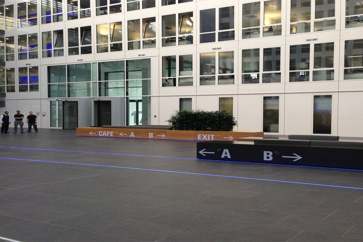 Blaue Leuchtlinien und das bodennahe Leitsystem stellen Bezüge zum Flughafenbetrieb her und werden so zum Markenbotschafter für Fraport.