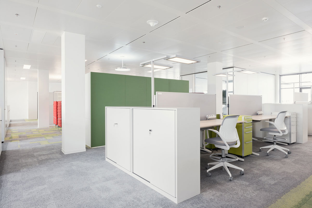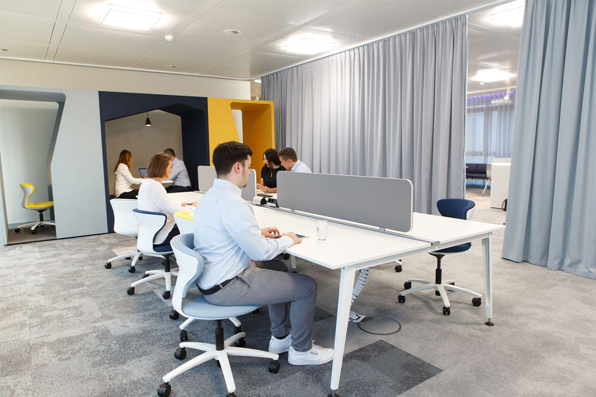 Teambereich („Homezone“) mit klassischen Arbeitsplätzen und Rückzugs- bzw. Besprechungsmöglichkeiten.
